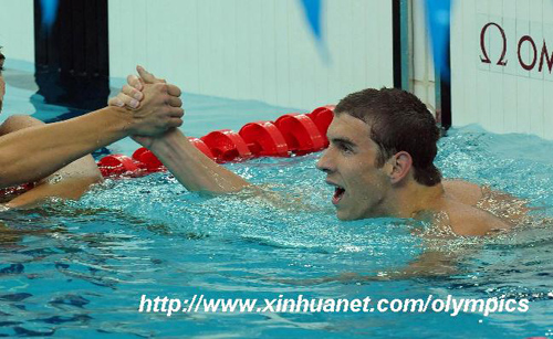 8月10日,美國選手菲爾普斯(右)賽后接受祝賀,他在男子400米個人混合泳決賽中,以4分03秒84的成績獲得冠軍,并打破世界紀錄。這是北京奧運會首枚游泳比賽金牌。 新華社記者陳凱攝