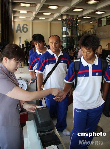 中華臺(tái)北棒球隊(duì)三十人于八月十日上午十時(shí)四十分,乘班機(jī)離臺(tái)赴北京參加奧運(yùn)會(huì)。圖為隊(duì)員在登機(jī)口驗(yàn)票。 中新社發(fā) 曾嘉 攝