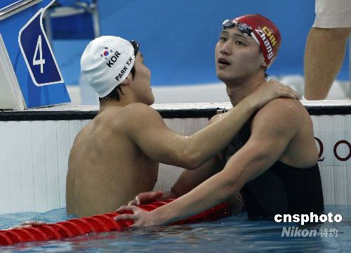 8月10日,北京奧運(yùn)會(huì)游泳項(xiàng)目男子400米自由泳決賽上午在水立方舉行,韓國選手樸泰桓以3分41秒86獲得金牌,中國選手張琳(右)以3分42秒44獲得銀牌,圖為二人互相致賀。中新社發(fā) 杜洋 攝