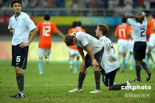 8月10日晚奧運(yùn)男足天津賽區(qū),美國迎戰(zhàn)荷蘭隊(duì),雙方最后以2:2戰(zhàn)平。圖為美國隊(duì)員遺憾沒守住最后3分鐘被荷蘭隊(duì)逼平。中新社發(fā) 陳文 攝