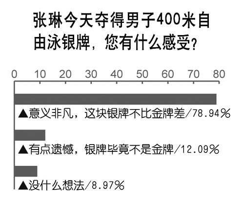 同時(shí),公眾高度評(píng)價(jià)張琳奪得男子400米自由泳銀牌。78.9%的人認(rèn)為這塊銀牌“意義非凡,不比金牌差”。只有12.1%的人表示“有點(diǎn)遺憾,銀牌畢竟不是金牌”,另有9.0%的人表示“沒(méi)什么想法”。