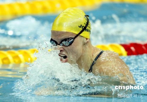 8月10日,澳大利亞著名選手瓊斯在女子100米蛙泳預(yù)賽中以1分05秒64的成績(jī),打破了由羅雪娟創(chuàng)造的1分06秒64的奧運(yùn)會(huì)紀(jì)錄。中新社發(fā) 杜洋 攝