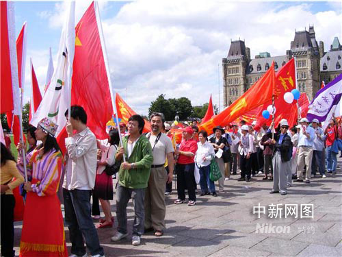演出結(jié)束后游行開始,三組形態(tài)各異的獅子生龍活虎地在隊伍前面引路,身穿少數(shù)民族服裝的朋友高舉“同一個世界,同一個夢想!”的橫幅緊隨其后,接著是彩旗儀仗隊,幾十面奧運五環(huán)旗、北京奧運會旗及加中兩國國旗迎風(fēng)招展。人們揮動手中的加中兩國國旗,熱情歡呼:中國加油!加拿大加油!北京奧運加油!游行隊伍長達一公里,最后到達渥太華市政廳。人們跳起秧歌,打起腰鼓,形成歡樂的海洋,一曲《歌唱祖國》表達了華人對祖國的思念;顒咏Y(jié)束時,無數(shù)彩色氣球飄向空中,帶走渥太華華人對奧運的祝福,對祖國的祝福!(完)