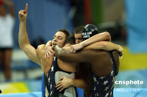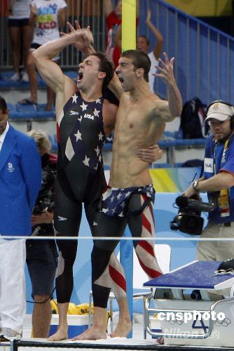 菲爾普斯(右)和隊(duì)友激情歡呼。