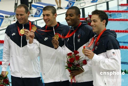 8月11日,美國隊奪得北京奧運會男子4x100米自由泳接力金牌,并打破該項目世界紀錄! ≈行律绨l(fā) 杜洋 攝