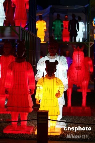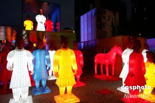北京CBD內充滿時尚感的世貿天階奧運文化廣場上,102尊兵馬俑彩燈擺出氣勢恢弘的陣形。不是遠自秦朝的陶土塑就,它們周身光彩奪目;不是身披鎧甲充滿殺氣,它們攜老扶幼,盡顯家庭歡樂。一個個燈彩透著歷史的深邃,也投身于眼前的奧運狂歡。從即日起至8月24日,他們將以特殊的方式為人們講述中華文化的源遠流長。中新社發(fā) 富田 攝