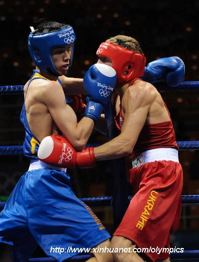 8月11日,中國選手胡青(藍)在拳擊男子輕量級60公斤級比賽中戰(zhàn)勝烏克蘭選手亞歷山大·克柳奇科,順利晉級下一輪。這是雙方選手在比賽中。新華社記者陳燮攝
