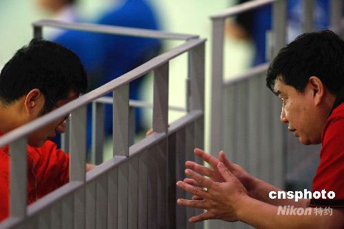 8月12日,北京奧運會男子50米手槍比賽在北京射擊館開戰(zhàn),譚宗亮和林忠仔代表中國射擊隊出戰(zhàn)。圖為在資格賽中,主教練王義夫臨場指導(dǎo)譚宗亮。中新社發(fā) 盛佳鵬 攝