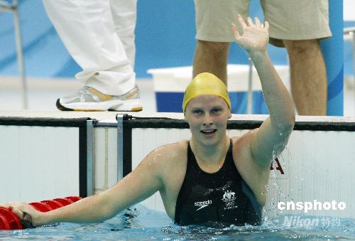 8月12日,澳大利亞選手萊塞爾·瓊斯在北京奧運會女子100米蛙泳決賽中,以1分05秒17的成績?yōu)榘拇罄麃嗞牜@得一枚金牌,并打破奧運會紀(jì)錄。 中新社發(fā) 杜洋 攝