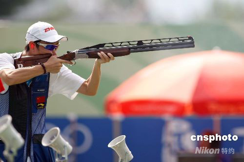 8月12日,北京奧運會男子飛碟雙多向決賽在北京射擊館進行,中國選手胡斌淵以資格賽第四的身份進入決賽,以184中獲得銅牌。美國選手格倫·埃勒以190中獲得金牌,意大利選手弗朗切斯科·達尼埃洛以187中獲得銀牌。圖為胡斌淵在比賽中。 中新社發(fā) 盛佳鵬 攝