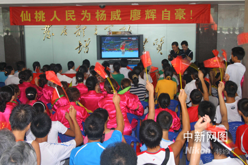 8月12日,楊威率領(lǐng)中國體操男隊奪得奧運會團體金牌。當日中午時分,當消息傳到楊威家鄉(xiāng)中國體操之鄉(xiāng)湖北仙桃市,早早守侯在電視機前的當?shù)毓賳T、民眾一片沸騰,人們敲鑼打鼓、齊鳴鞭炮,熱烈慶賀仙桃籍運動員楊威再次獲得奧運會體操男團冠軍。