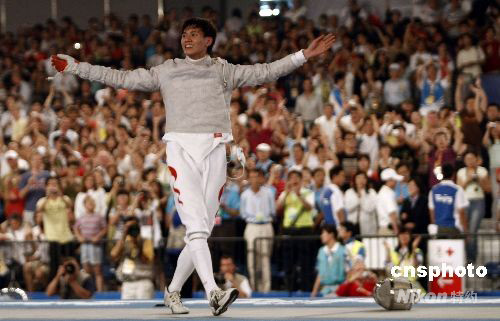 8月12日晚,08北京奧運會男子佩劍個人賽決賽在北京國際會議中心擊劍館揭開戰(zhàn)幕,賽會黑馬14號種子中國選手仲滿和法國選手洛佩茲在決賽中遭遇,結果中國選手仲滿以15-9戰(zhàn)勝對手獲得冠軍,這是中國男子擊劍在奧運會上第一次獲得冠軍。 中新社發(fā) 盛佳鵬 攝