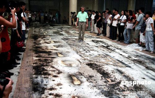 圖為蔡國(guó)強(qiáng)站在爆破畫上進(jìn)行最后檢閱。