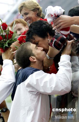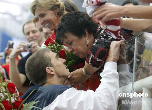 圖:菲爾普斯“水立方”奪冠后擁吻媽媽