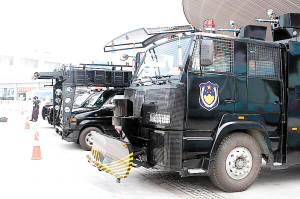 目前,本市(天津)特警300余人24小時護衛(wèi)奧運會天津賽區(qū)安全。昨天,記者探訪了在水滴實施護衛(wèi)的特警突擊車、裝甲車、運兵車和水炮車。