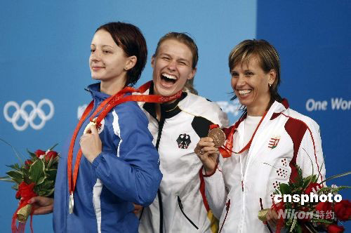 德國選手布麗塔-海德曼(中)以15-11戰(zhàn)勝羅馬尼亞選手安娜-瑪麗亞-布倫澤(左),獲女子重劍個人冠軍。