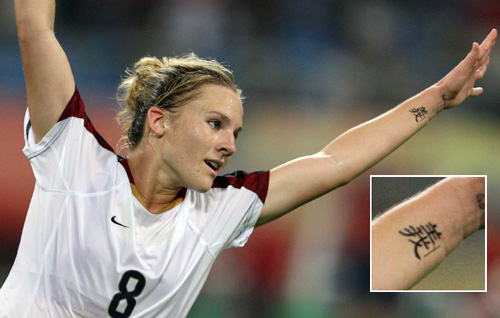 美國(guó)女足運(yùn)動(dòng)員艾米·羅德里格斯在比賽中慶祝進(jìn)球,展現(xiàn)漢字“義”的紋身。中新社記者 張宇攝