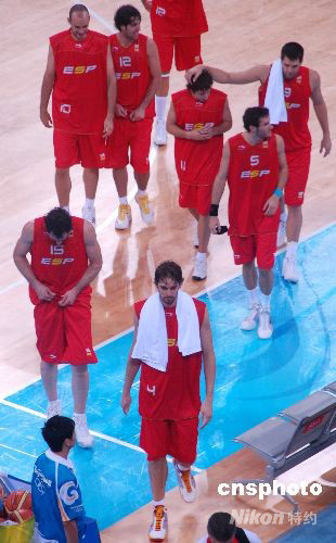2008年8月14日上午,加索爾領(lǐng)銜的世錦賽和歐錦賽冠軍西班牙隊(duì)在奧運(yùn)會(huì)籃球小組賽中,以72比59戰(zhàn)勝諾維斯基領(lǐng)銜的德國(guó)戰(zhàn)車。 中新社發(fā) Eddie Zhang 攝