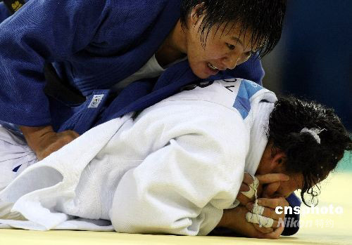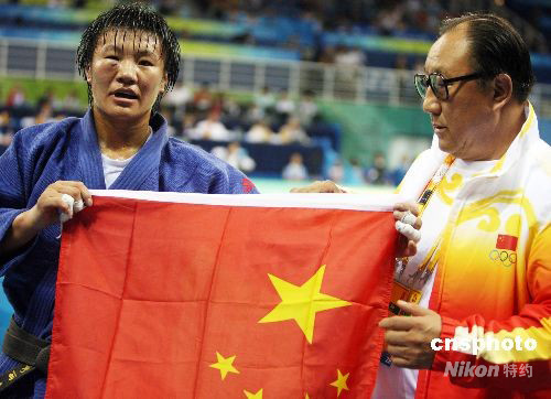 楊秀麗獲得金牌后,與中國柔道隊(duì)總教練劉永福向熱情的觀眾展示國旗。