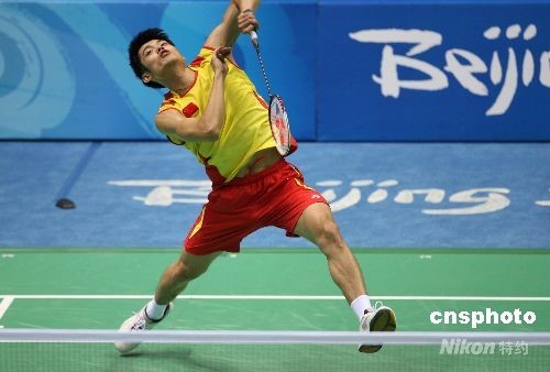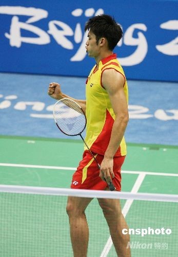 8月15日,中國選手林丹在北京奧運(yùn)會羽毛球男子單打半決賽中以2比0戰(zhàn)勝隊(duì)友陳金,進(jìn)入決賽。中新社發(fā) 武仲林 攝
