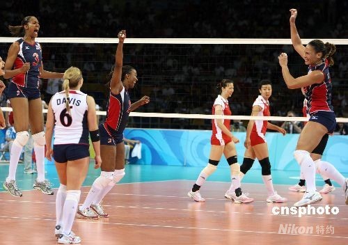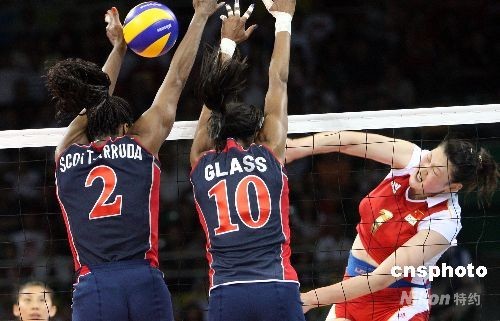 8月15日晚,北京奧運(yùn)會女排小組賽中國與美國之戰(zhàn)在北京奧運(yùn)會排球比賽館--首都體育館舉行,這場被戲稱為“和平大戰(zhàn)”的比賽最后時刻,兩名美國選手封死了中國隊(duì)王一梅的扣殺而以3比2戰(zhàn)勝中國女排。中新社發(fā) 任晨鳴 攝