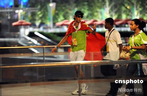 8月16日凌晨,外國(guó)觀眾身披中國(guó)國(guó)旗游覽奧林匹克公園。中新社發(fā) 廖攀 攝
