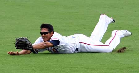 北京奧運(yùn)棒球賽13日在五棵松體育中心舉行中華臺(tái)北隊(duì)對(duì)荷蘭隊(duì)之戰(zhàn),中華臺(tái)北隊(duì)選手林哲瑄一個(gè)漂亮的接殺,整個(gè)人撲倒在地上。(下圖)