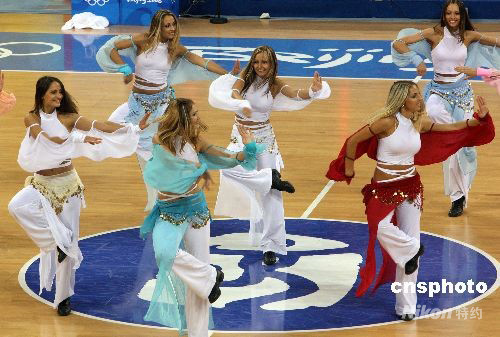 北京奧運(yùn)會(huì)男子籃球小組賽第四輪比賽8月16日在五棵松籃球館舉行,“北京夢(mèng)幻之舞”拉拉隊(duì)的烏克蘭姑娘為觀眾表演新學(xué)的“中國(guó)功夫”。中新社發(fā) 任晨鳴 攝