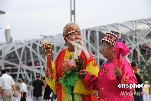 8月16日,北京奧林匹克公園,來自石家莊的民眾穿著中國壽星裝束游覽奧林匹克公園。中新社發(fā) 廖攀 攝