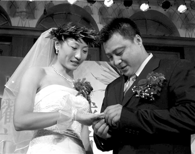 2004年10月8日,新郎于洋(右)為新娘張寧佩戴婚戒
