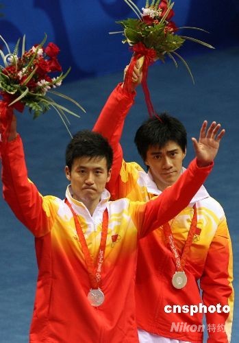 8月16日晚,中國選手蔡赟、傅海峰在北京奧運(yùn)會男子雙打決賽中不敵印度尼西亞選手馬爾基斯·基多、亨德拉·塞蒂亞萬,獲得銀牌。中新社發(fā) 武仲林 攝