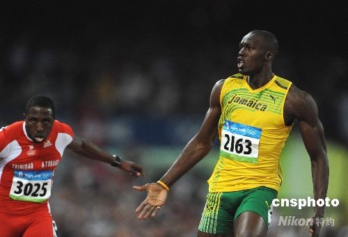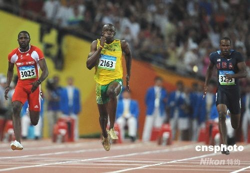 8月16日晚,牙買加選手尤塞恩·博爾特在中國國家體育場“鳥巢”進行的北京2008年第二十九屆奧運會男子100米決賽中,以9秒69的成績奪得金牌并打破9秒72的世界紀錄。中新社發(fā) 古玉 攝