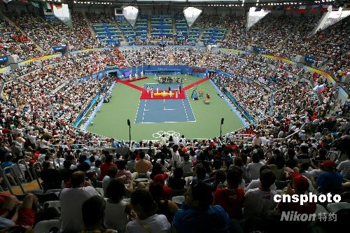 8月17日,北京奧運(yùn)會(huì)網(wǎng)球女單、男單決賽隆重上演,中心球場(chǎng)座無虛席。 中新社發(fā) 武仲林 攝