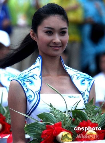 8月17日傍晚,北京2008奧運帆船比賽在青島分賽場舉行,身著“青花瓷”頒獎服窈窕的禮儀小姐格外搶眼。中新社發(fā) 趙振清 攝