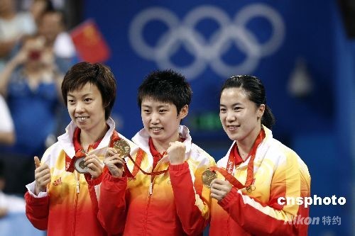 中國(guó)隊(duì)員張怡寧、郭躍、王楠笑開(kāi)顏。中新社發(fā) 盛佳鵬 攝