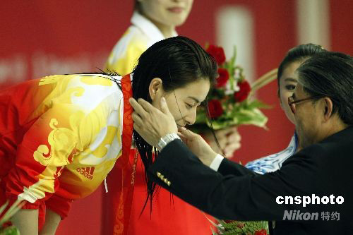 8月17日,中國選手郭晶晶獲得女子3米板跳水冠軍,霍震霆為郭晶晶頒發(fā)金牌。中新社發(fā) 杜洋 攝