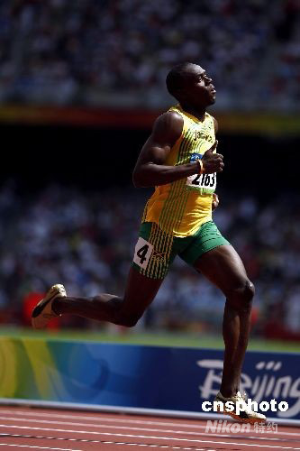 8月18日,北京奧運(yùn)會男子200米預(yù)賽在北京國家體育場“鳥巢”舉行,剛拿到奧運(yùn)百米冠軍的牙買加選手博爾特輕松晉級下一輪比賽。 中新社發(fā) 盛佳鵬 攝
