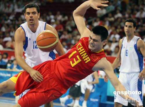 北京奧運會男子籃球小組賽第五輪比賽8月18日在五棵松籃球館舉行,由姚明統(tǒng)率的中國隊與世界勁旅希臘隊為八強位置展開激戰(zhàn),最終,實力不足的中國隊以77比91告負(fù);雖然姚明砍下全隊最高的16分,但對全局無濟于事。 中新社發(fā) 任晨鳴 攝