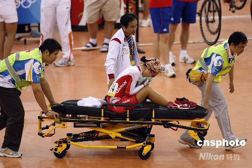 8月18日,場(chǎng)地自行車(chē)女子記分賽決賽在北京老山自行車(chē)館進(jìn)行,14號(hào)日本選手和田見(jiàn)里美在比賽中與其他選手相撞受傷。 中新社發(fā) 盛佳鵬 攝