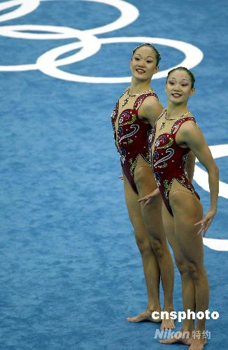 8月18日,北京奧運會花樣游泳比賽在“水立方”拉開帷幕,在首場比賽雙人技術自選項目中,中國選手蔣文文、蔣婷婷以48.084的總分排名第四位。 中新社發(fā) 杜洋 攝