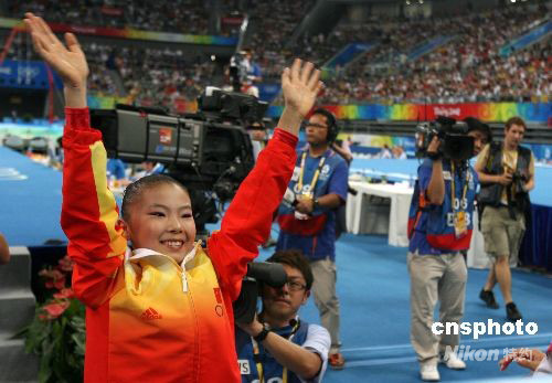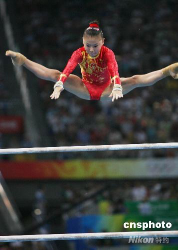 8月18日,中國(guó)選手何可欣在北京奧運(yùn)會(huì)女子高低杠決賽中表現(xiàn)出色,奪得金牌。 中新社發(fā) 武仲林 攝