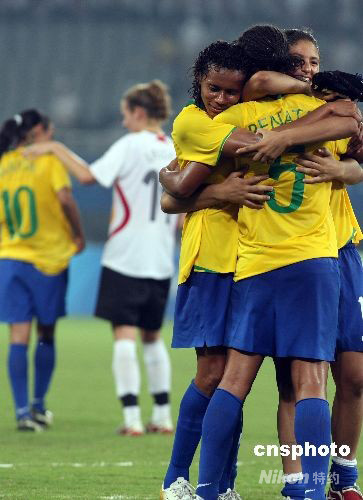 8月18日,北京奧運(yùn)會女足半決賽,德國對陣巴西的比賽在上海體育場進(jìn)行。最終,巴西隊(duì)以4:1戰(zhàn)勝德國隊(duì)晉級決賽。 中新社發(fā) 湯彥俊 攝