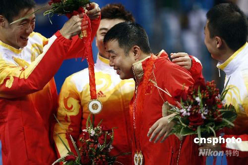 圖:男團奪冠 隊員把金牌獻給劉國梁
