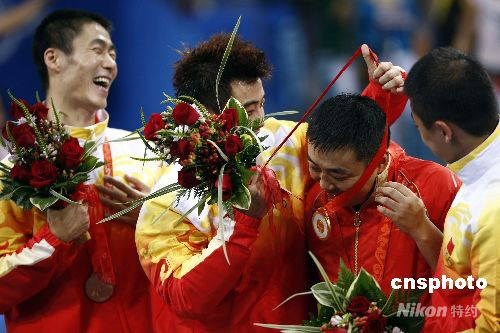 8月18日,2008年北京奧運會乒乓球男團決賽中國隊與德國隊的較量在北京大學體育館展開,中國隊憑借出色的表現(xiàn),以3比0擊敗德國隊奪冠。圖為領獎臺上,王皓、王勵勤、馬琳將三塊金牌都歸功于教練劉國梁。