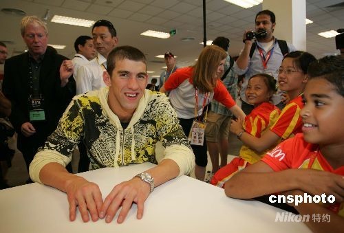 2008年8月18日,奧林匹克公園餐廳內(nèi),菲爾普斯小朋友交談。當(dāng)日,獲得8枚奧運金牌的美國游泳冠軍菲爾普斯來到奧林匹克公園餐廳與40多名中外各國的“奧運助威小冠軍”見面交流,與小朋友們一起分享勝利的喜悅。中新社發(fā) 曉村 攝