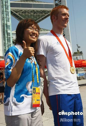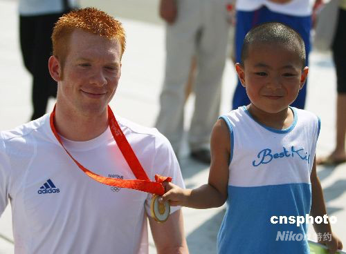 8月19日,獲得北京奧運(yùn)會(huì)自行車團(tuán)體追逐賽冠軍的英國(guó)自行車運(yùn)動(dòng)員在奧林匹克公園內(nèi)接受媒體采訪,大批觀眾、游客和志愿者紛紛上前與其合影。而英國(guó)自行車運(yùn)動(dòng)員也依然沉浸在獲得金牌的喜悅中,做起了“模特”。 中新社發(fā) 劉新 攝