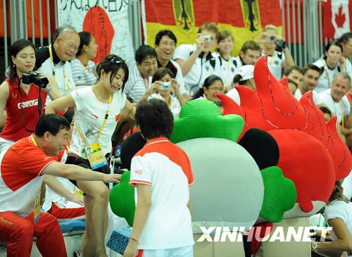 8月19日,中國選手郭晶晶在觀看比賽前和福娃合影。當(dāng)日,北京奧運(yùn)會跳水比賽在國家游泳中心——“水立方”繼續(xù)進(jìn)行,何沖在男子3米跳板決賽中獲得冠軍。 新華社記者趙鵬攝