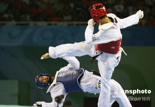 8月20日,中華臺北選手朱木炎(紅衣)戰(zhàn)勝泰國選手楚差瓦·考勞,奪得北京奧運(yùn)會跆拳道男子58公斤級銅牌。