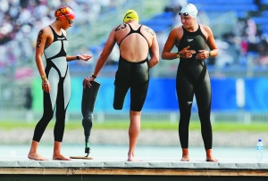 昨天的順義奧林匹克公園,冠軍、亞軍、季軍依次游過終點,不過觀眾們?nèi)栽诘却粋人。在所有人眼中,她也是這場比賽的英雄。當(dāng)南非選手納塔莉·杜托伊特第十六個游過終點,所有觀眾起立為她歡呼。作為奧林匹克史上第一個截肢運動員,獲得冠軍的俄羅斯選手拉里莎認為她也值得獲一枚獎牌,“并不是精神意義的,而是競技意義上的!