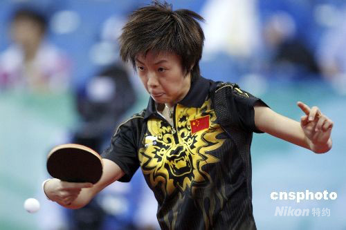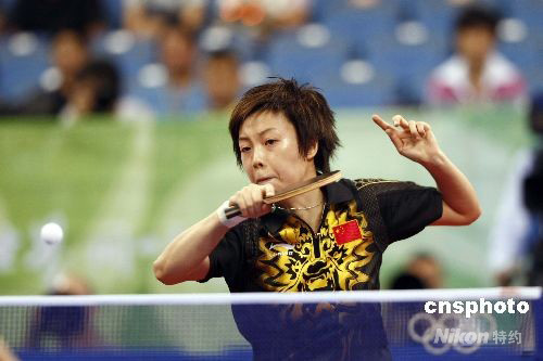 8月21日,北京奧運會乒乓球女子單打第四輪的比賽在北京大學體育館進行,中國選手張怡寧4比1戰(zhàn)勝日本選手福原愛晉級下一輪比賽。中新社發(fā) 盛佳鵬 攝